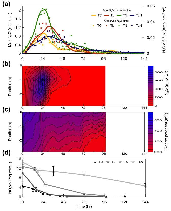 圖 1. 平均最大 N2O 濃度的發展和觀察到的擴散通量 (a),N2O 濃度隨時間變化的處理時間和深度特定等值線圖 TC (b),處理 TC (c) 的氧化還原電位隨時間的時間和深度特定等值線圖和土壤核心中 NO3 濃度隨時間的總和 (d)。 對于輪廓 處理圖 TL、TN 和 TLN 參見 SI。