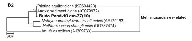 圖 8 (A) 沉積物深度 1 cm 和 2 cm(表層)、4 cm 和 10 cm 處細(xì)菌和古菌數(shù)量的比例和細(xì)菌系統(tǒng)發(fā)育的分布。 (B-1, B-2) 從表層沉積物 (1 和 2 cm)、4 cm 和 10 cm 中獲得的細(xì)菌 (B-1) 和古菌 (B-2) 序列的最大似然樹。 粗體字母表示本研究中檢測到的克隆。 以粗體字母顯示的封閉數(shù)字表示檢測到的克隆數(shù)。 Bootstrap 值(高于 50%)基于 100 次重復(fù)。
