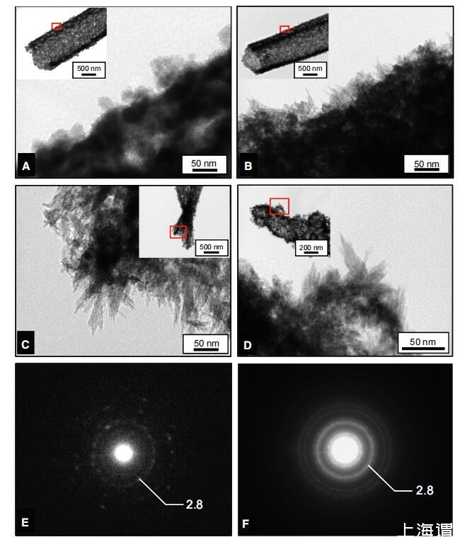 TEM 觀察揭示了在莖和鞘周圍沉淀的礦物的形態(tài)特征和空間排列(圖 7A、F)。 在 1 cm 深度處,莖和鞘表面覆蓋有細(xì)顆粒的短程有序 Fe(III) 羥基氧化物,其由球形聚集體(直徑 25-50 nm;圖 7A)組成。 然而,在3 cm以下沉積深度處莖和鞘周圍的Fe礦物形態(tài)特征與在1 cm處觀察到的不同。 在這些更大的深度(例如,4 和 7 厘米),莖和鞘表面鑲嵌著針狀微結(jié)構(gòu)(30-70 納米長和 5 納米寬;圖 7B、D)。 盡管大多數(shù)針狀礦物顯示出寬選區(qū)電子衍射 (SAED) 圖案,但在 2.8 ? A(圖 7E、F)。 已知菱鐵礦在 ~2.8 處具有強(qiáng)烈的 SAED 反射? A (Graf, 1961) 并且根據(jù) EXAFS 和 XRD 分析建議存在菱鐵礦,我們得出結(jié)論,針狀礦物很可能是菱鐵礦。 針狀礦物還顯示 4.1、2.6 和 2.4 的 d 間距值? A、與針鐵礦的SAED反射一致。