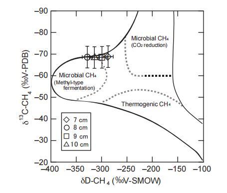 7 cm以下的孔隙水濃度較高,測得了呼吸的穩(wěn)定同位素值。 d13C 的值范圍為 -68.4& 至 -68.8&,dD 的值范圍為 -287& 至 -328&(圖 4)。 根據(jù) Whiticar (1999) 的分類,這些值處于或接近微生物發(fā)酵的范圍,特別是由醋酸碎屑和甲基營養(yǎng)甲烷產(chǎn)生的發(fā)酵。