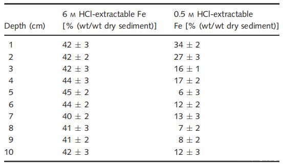 表 2 干沉積物深度中 6 M HCl 可萃取 Fe 和 0.5 M HCl 可萃取 Fe 的濃度 (wt/wt)。 從重復(fù)測量計(jì)算標(biāo)準(zhǔn)偏差