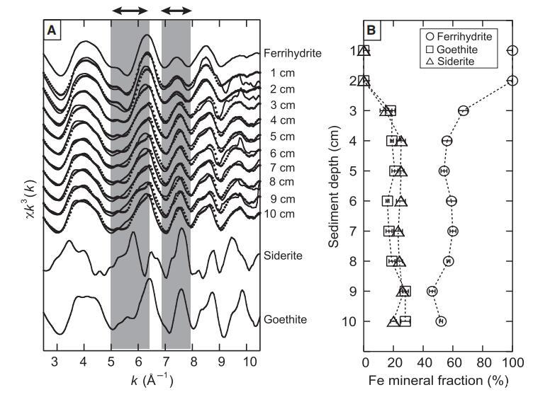 沉積物中鐵礦物成分的變化是通過散裝鐵 K 邊緣 EXAFS 分析確定的(圖 5A)。 EXAFS 光譜的變化主要在 2 到 4 厘米的深度處觀察到。 EXAFS 的空間變化的特征在于(i)在 k = 5.0 和 6.3 之間是否存在寬肩? A-1 和 (ii) k 處的峰值位置和振蕩幅度的變化范圍從 6.9 到 7.9 A-1(圖 5A 中的箭頭和灰色陰影指示的區(qū)域)。 在 k 范圍在 2.5 和 10.5 ? 一種? 1(圖5B)。 在 1 到 2 厘米的深度之間,擬合結(jié)果表明水鐵礦是唯一存在的女性物種。 然而,在 3 cm 以下,除了水鐵礦之外,還發(fā)現(xiàn)菱鐵礦和針鐵礦。 菱鐵礦的估計(jì)比例在 3 至 4 厘米深度之間從 15% 增加到 25%,并在 4 厘米以下深度保持相對穩(wěn)定。 針鐵礦的比例在 3 到 10 厘米之間從 16% 到 28% 不等。 建議的菱鐵礦和針鐵礦存在于 3 cm 以下的深度與 X 射線衍射(XRD)分析的結(jié)果一致(圖 S2)。 基于所述擬合結(jié)果,水鐵礦似乎是在所有測試的深度(1-10厘米)占主導(dǎo)地位的鐵礦物種。