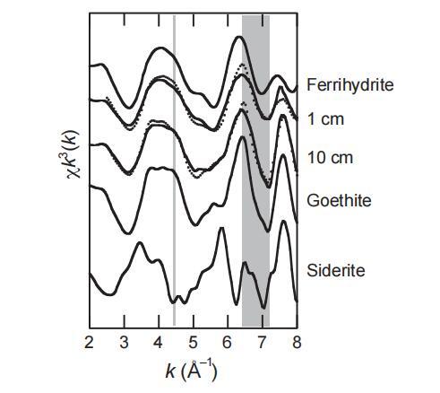 在 CEY 模式下在 1 和 10 cm 沉積物深度獲得的 Fe K-edge EXAFS 光譜如圖 6 所示。 CEY 模式通常提供粒子表面亞微米級的探測深度,因?yàn)橛邢薜奶右萆疃入娮樱↖tai 等人,2008 年)。 在 1 cm 處獲得的 CEY-EXAFS 光譜顯示 EXAFS 特征類似于散裝 EXAFS 光譜的那些特征,除了 k 處的峰值位置范圍從 7.4 到 7.6 ? 一種? 1(圖 5A 和 6)。 通過線性組合擬合(k 范圍 = 2.5 至 8.0 ? A? 1 )對 Fe 礦物種類分布的定量估計(jì)表明,1 cm 處 73% 的 Fe 是水鐵礦,而 27% 是針鐵礦(表 3)。 與 CEY 和塊狀 EXAFS 結(jié)果在 1 cm 處的相似性相反,10 cm 深度處的 CEY-EXAFS 光譜與塊狀 EXAFS 的光譜不同。 CEY-EXAFS 在 k = 4.4 處達(dá)到峰值? 一種? 1 和 k 處的振蕩幅度為 6.4 ? 一種? 1 到 7.6 ? 一種? 1(圖 6 中由灰色陰影表示的區(qū)域)對于 CEY-EXAFS 是獨(dú)特的,這在批量 EXAFS 中沒有觀察到。 CEYEXAFS 光譜在 10 cm 處的線性組合擬合表明針鐵礦、水鐵礦和菱鐵礦分別占總鐵礦物分布的 65%、20% 和 15%。 CEY-EXAFS 擬合估計(jì)的水鐵礦比例小于散裝 EXAFS 擬合估計(jì)的比例(52%)。