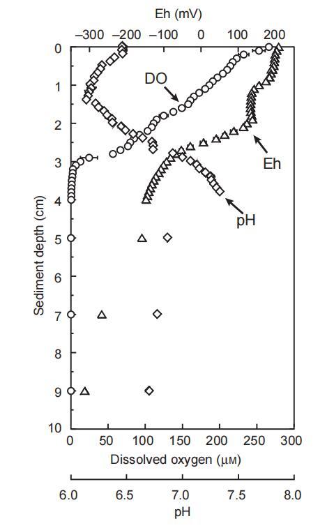 使用微電極以 1 mm 或 2 cm 的間隔確定 0-10 cm 深度的孔隙水 pH、Eh 和 DO 的垂直剖面(圖 2)。 觀察到 DO 隨著沉積物層加深而不斷減少,并在沉積物深度低于 3 cm 時(shí)完全耗盡。 沉積物表面的 Eh 為 208 mV,觀察到 Eh 在 1 cm 深度處略有下降。 Eh 在 2 到 3 cm 的深度從 123 mV 顯著降低到 -92 mV。 在 3 cm 以下的深度,Eh 逐漸降低至 -312 mV。 0 到 1.5 cm 深度之間沉積物的 pH 值從 6.5 略微下降到 6.1。 相比之下,1.5 到 4 厘米深處的沉積物的 pH 值從 6.3 增加到 7.4。 在 4 厘米以下的深度,pH 值從 6.5 到 7.0 不等。