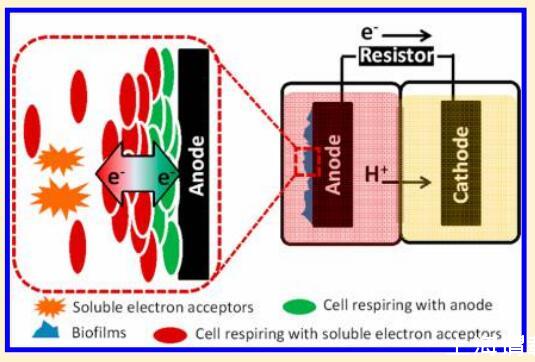 添加有利的電子受體如Fe(III)或硝酸鹽被認為是刺激污染場地生物修復的一種有希望的策略 ? 5代表性微生物燃料電池(MFC)的生物電化學系統(BES)為細菌(外電)提供一個陽極作為固體電子受體,同時在污染環境中發電和進行生物修復。6,7, BES為理解細菌和固體電子受體(如電極、礦物或其細菌伙伴)之間的電子轉移機制提供了一種新的、可量化的工具。 BES應用的一個重要問題是替代電子受體(如O2、硝酸鹽、硫酸鹽或CO2)在復雜環境系統中的普遍性。8 ? 10理論上,替代電子受體的存在可能會消散流向陽極的電子流,并影響BES的性能。 然而,與直覺相反,一些研究報告表明,不同的細菌呼吸可能同時發生,甚至在BES中相互增強,9,11,12表明現場應用的BES中的微生物電子轉移網絡可能比預期的更復雜。