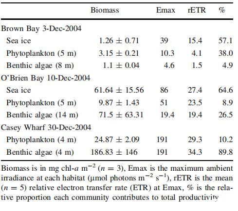 P一地區記錄的值基本一致。雖然Fv/Fm、Ek、a和rETRmax(冰層破裂前)具有可比性,但在2003年的研究中(McMinn等人,2004年),冰層破裂后的rETRmax相當高。然而,由于無法進行分類比較,因此無法確定原因。