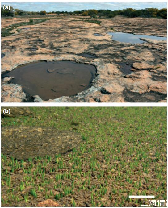 圖1澳大利亞西南部的臨時花崗巖巖池(a)和典型的水下植被(b)。臨時巖石池每年冬天都會有雨水供應(yīng),持續(xù)3-5個月。水淺(5–10 cm),電導(dǎo)率低(<10–80 lS cm)1);沉積物由風化花崗巖組成,有機質(zhì)含量低(2.3±0.6%DW;n=5),深度通常小于2 cm。然而,密集的水韭種群通常會發(fā)育(b),并且可以與其他植物(舌苔屬、厚殼水韭、Marselia和Eleocharis)共存,這是臨時花崗巖巖池的典型特征(Tuckett等人,2010)。巴,5厘米。