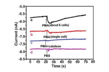 圖11金/鉑粒子混合納米結構的微電極檢測乳腺癌細胞釋放的過氧化氫I?t曲線[13]。(a)在丙二醇甲醚醋酸酯(PMA)刺激下從6個MCF?7細胞中釋放H2O2;(b)從單個MCF?7細胞中釋放H2O2;(c)細胞與過氧化氫酶孵化之后在PMA刺激之后MCF?7細胞釋放過氧化氫;(d)在磷酸緩沖鹽溶液刺激下MCF?7細胞釋放過氧化氫