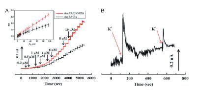 圖53?巰基丙酸修飾的金環微電極記錄鼠腦紋狀體中兒茶酚胺的釋放量[12]。(A)在0.2V電壓下修飾3?巰基丙酸之前(黑線)和修飾3?巰基丙酸之后(紅線)檢測多巴胺的I?t圖;(B)3?巰基丙酸修飾的金環微電極記錄鼠腦紋狀體中兒茶酚胺的釋放