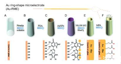 圖1金環微電極的制作步驟[12]。(A)拉制好的空玻璃毛細管;(B)毛細管內壁羥基化;(C)毛細管內壁自組裝上聚多巴胺層;(D)內壁生長金納米粒子;(E)形成金膜;(F)金環微電極尖端修飾3?巰基丙酸