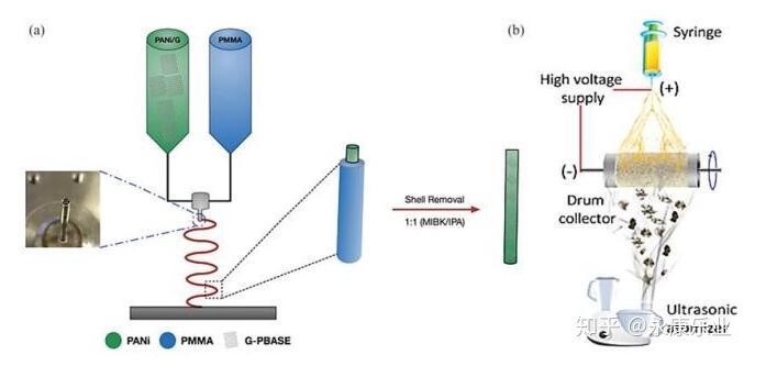 圖1(a)采用同軸電紡絲制備PANi/G-PBASE/PMMA納米纖維的機理圖;(b)采用電紡絲并結(jié)合超聲噴涂的機理圖。