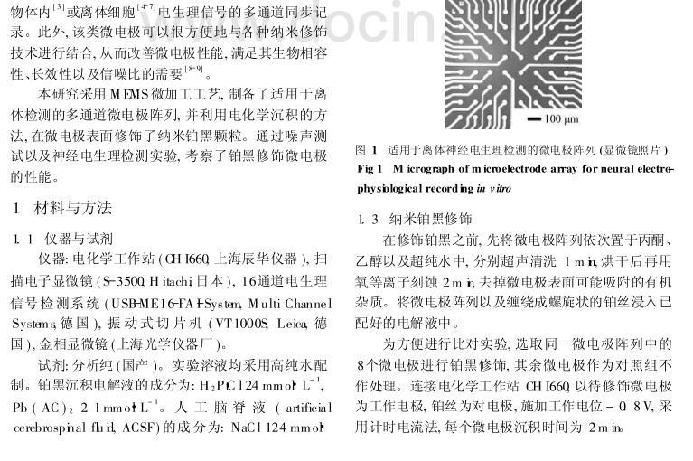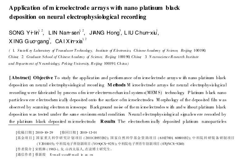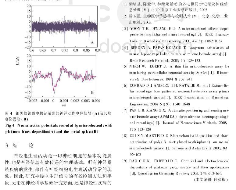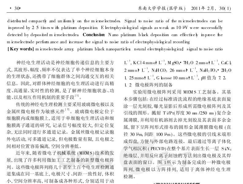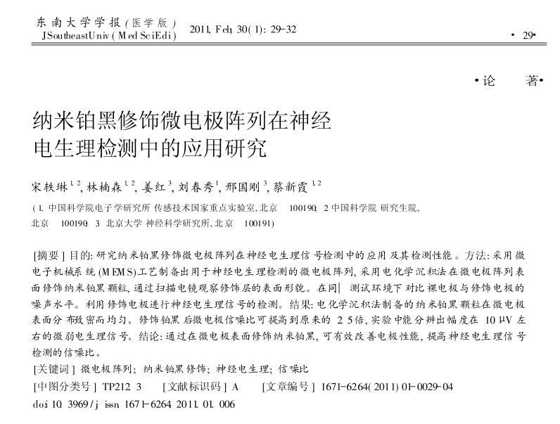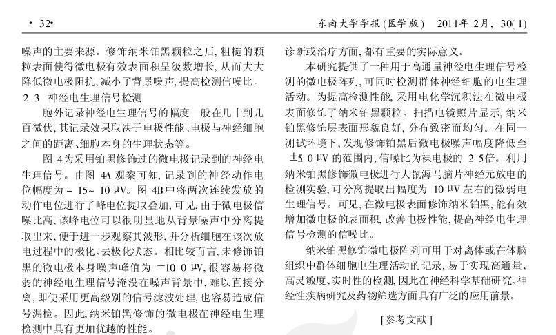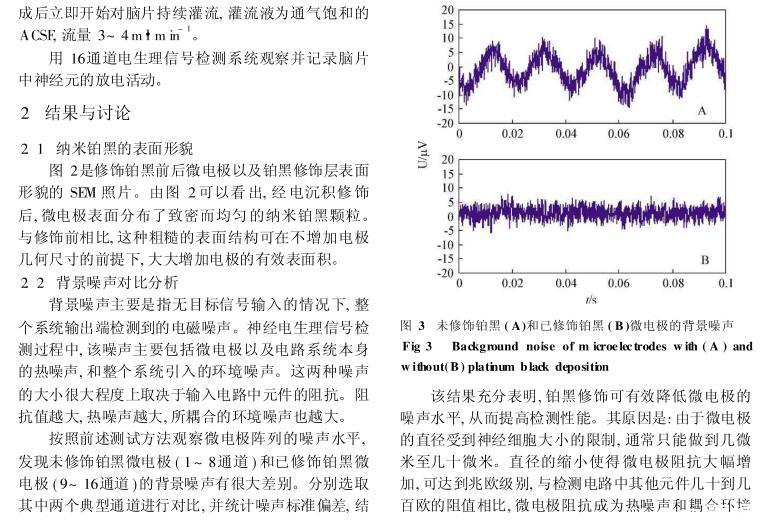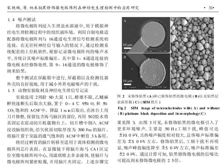 結(jié)果:電化學(xué)沉積法制備的納米鉑黑顆粒在微電極表面分布致密而均勻。修飾鉑黑后微電極信噪比可提高到原來的2.5倍,實(shí)驗(yàn)中能分辨出幅度在10μV左右的微弱電生理信號(hào)。結(jié)論:通過在微電極表面修飾納米鉑黑,可有效改善電極性能,提高神經(jīng)電生理信號(hào)檢測(cè)的信噪比。