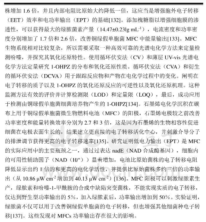 本研究以銅綠假單胞菌(Pseudomonas aeruginosa ATCC 9027)為產(chǎn)電菌株,通過粉末微電極的應(yīng)用和合適的分析方法的選擇,實現(xiàn)不同位置的陽極液中電子介體(吩嗪)的實時監(jiān)測和利用生物膜抑制劑(魚腥草素鈉)抑制生物膜的形成,并通過電化學(xué)分析方法進行研究,提出銅綠假單胞菌胞外電子傳遞機理。