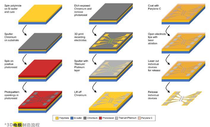 研究人員在硅襯底上制造了多孔電極用于刺激神經元。使用金屬接觸焊盤和跡線直接在硅晶片上圖案化。然后用SU-8對跡線進行絕緣,并涂覆鉻犧牲層。SU-8層和鉻層都被圖案化,為印刷品和接觸焊盤打開窗口。電極結構被3D打印、金屬化,然后鉻被蝕刻以去除不需要的金屬。