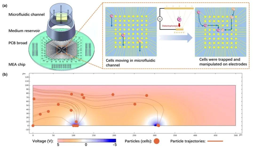 圖1.細胞操控裝置及原理:(a)裝置示意圖,主要包括具有微流控結(jié)構(gòu)的MEA芯片。細胞被捕獲并在電極之間轉(zhuǎn)移以實現(xiàn)精確的操控;(b)細胞捕獲過程的模擬結(jié)果。細胞從左側(cè)釋放,以10μm/s的流速移動。隨后,電極利用介電泳力將細胞捕獲。