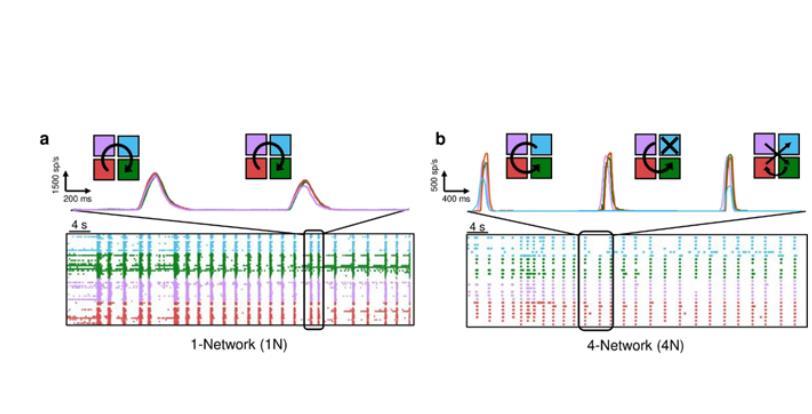 圖3.代表性的(a)單網絡(1N)和(b)四網絡系統(4N)的60 s電生理活動周期。5-s時間窗對應的瞬時發射速率分布在頂部,以及簇激活序列的傳播圖草圖。每種顏色表示一個“虛擬”(1N)或4N集群,而箭頭表示集群之間的網絡爆發傳播。在1N的情況下,涉及到所有的虛擬集群,而在4N的情況下,第一次和第三次網絡爆發涉及到所有的集群,而第二次網絡爆發沒有涉及到青色集群。
