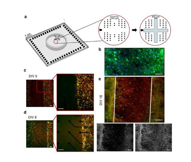 圖1.(a)十字形PDMS掩模在MEA上的定位。黑點表示電極位置;左邊的黑色梯形形狀代表參比電極。MEA的有效區域由1.8 mm×1.4 mm矩形的4個電極簇組成,其中每個電極簇由13個電極組成(?=30μm),另外7個電極位于簇之間。(b)具有代表性的四神經網絡(4N)在體外(DIV)18天的免疫熒光圖像,其中樹突狀微管相關蛋白(MAP2,綠色)和細胞核(DAPI,藍色)被標記。代表性4N培養物的免疫熒光圖像(c)在DIV 5,(d)DIV 8,(e)DIV 18。在兩個不同的神經網絡(簇)之間建立軸突連接,其中樹突微管相關蛋白(MAP2,綠色)和軸突微管相關蛋白(Tau,紅色)被標記。在DIV 5移除十字形掩膜。白色的疊加線劃定了之前被十字形掩模占據的區域。比例尺:100μm。