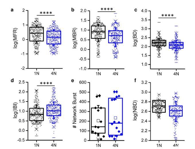 圖2.單網絡(1N,黑色)和四網絡(4N,藍色)組件中的峰值和爆發活動。(a)平均發射速率(MFR),(b)平均爆發率(MBR),(c)爆發持續時間(BD),(d)爆發間隔(IBI),(e)網絡爆發數,(f)網絡爆發持續時間(NBD)。(a-d、f)每個數據點表示相對于單個電極的特定度量(MFR,MBR等)的值。(e)每個數據點相對于多邊環境協定。
