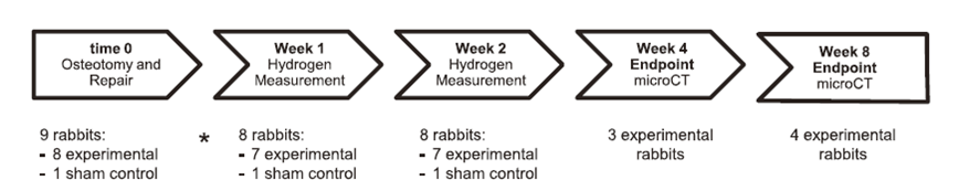圖1、每次實驗所需的時間評估表和樣本量。研究開始用的是9只兔子,其中8只被分配到接受截骨術和修復,1只經過手術后的兔子(對照組)沒有接受截骨術或修復。手術后第三天,1只兔子死亡,H2監測程序被移除了。