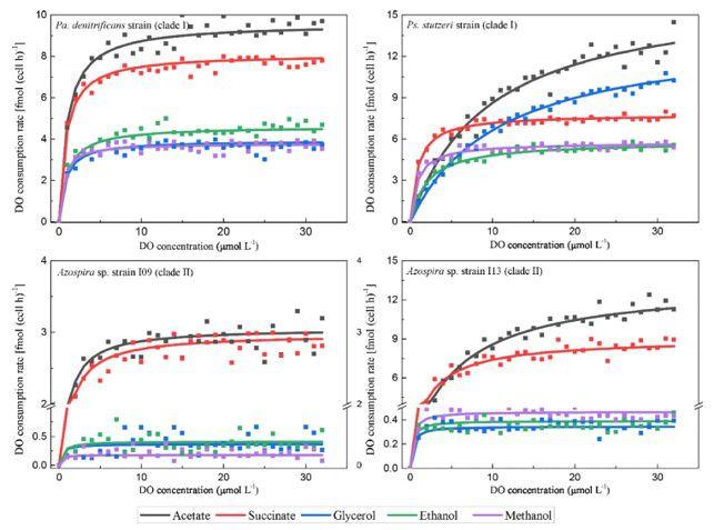 圖3、以乙酸、琥珀酸、甘油、乙醇和甲醇為碳源對應的反硝化細菌(clade I)、施式假單胞菌(cladeⅡ)/固氮羅菌屬I09(cladeⅡ)、固氮羅菌屬I13(cladeⅡ)的氧氣消耗率的全細胞Michaelis-Menten曲線。這些數(shù)據(jù)是從三次試驗中獲得的。