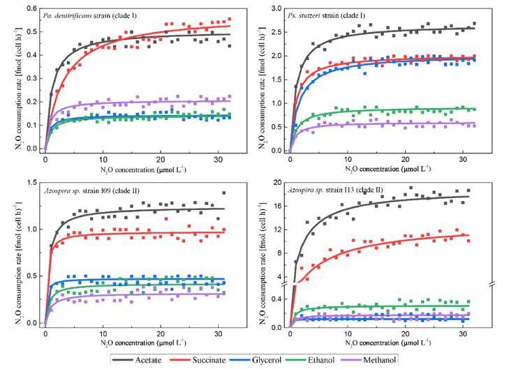 利用一氧化二氮(N2O)還原細菌是減少工程系統(tǒng)的N2O足跡的一種很有前景的策略。使用優(yōu)選的有機碳源作為電子供體可加速這些細菌對N2O的消耗。然而當喂食不同的有機碳物種時,它們的N2O消耗潛力和活性仍不清楚。本論文研究人員通過研究它們的生物動力學特性和基因組潛力,系統(tǒng)地比較了各種有機碳源對N2O還原細菌活性的影響。五種有機碳源——乙酸鹽、琥珀酸鹽、甘油、乙醇和甲醇被送入四個含有進化枝I或進化枝II nosZ基因的N2O還原細菌。