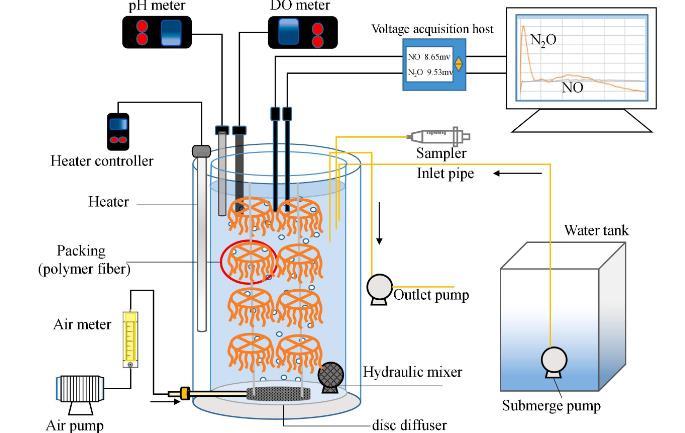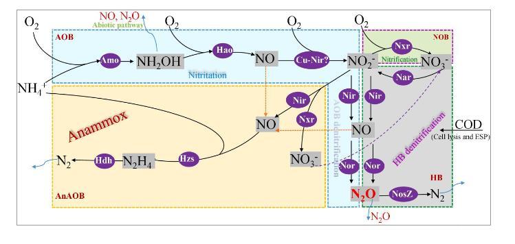 背景介紹:部分亞硝化和厭氧氨氧化(PN-A)工藝被認(rèn)為是一種很有前途的廢水脫氮方法,目前正在開發(fā)中。與傳統(tǒng)的脫氮工藝相比,PN-A工藝具有約62.5%的耗氧量減少、100%的外部碳源需求減少、90%的剩余污泥產(chǎn)量和零碳排放等優(yōu)點(diǎn)。目前,超過80%的現(xiàn)有全尺寸厭氧氨氧化裝置是一級PN-A,因為這種配置具有占地少、操作更簡單、底物抑制少等顯著優(yōu)勢。一級PN-A過程主要包括兩條自養(yǎng)途徑,其中氨氧化細(xì)菌(AOB)用氧氣將銨(NH4+)氧化為亞硝酸鹽(NO2–),而厭氧氨氧化細(xì)菌(AnAOB)將剩余的NH4+和NO2–轉(zhuǎn)化為氮?dú)?N2)即使有大量的研究致力于啟動PN-A過程,啟動持續(xù)時間和性能各不相同,機(jī)制仍不清楚。有研究證實一氧化氮(NO)是亞硝化作用的確定和關(guān)鍵中間體以及厭氧氨氧化。PN-A系統(tǒng)中的N2O排放量甚至高于傳統(tǒng)的硝化/反硝化系統(tǒng)。因此N2O排放是PN-A工藝的一個重要評價指標(biāo)。盡管大量研究致力于PN-A工藝的啟動和運(yùn)行,但很少研究NO和N2O的產(chǎn)生。
