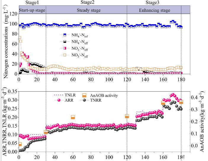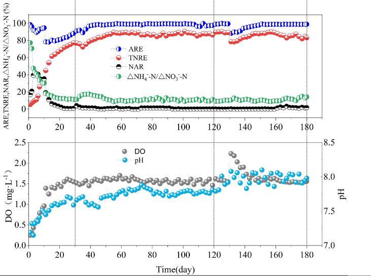 圖2、PN-A工藝的啟動和增強(qiáng)(TNLR表示總氮負(fù)荷率,ARR表示氨去除率,TNRR表示總氮去除率,ARE表示氨去除率,TNRE表示總氮去除率,NAR表示亞硝酸鹽積累率,△NO3–-N/△NH4+-N表示除去氨后產(chǎn)生的硝酸鹽。檢測出水的pH值。DO濃度是循環(huán)氧化階段的平均值。從圖中可看出AOB活動一開始就保持在高位,ARE為98.4%。DO濃度增加而ARE減少結(jié)果表明,COD在一開始是有氧消耗的,而之后可能在生物膜內(nèi)發(fā)生厭氧氨氧化或異養(yǎng)反硝化,NOB被部分抑制。