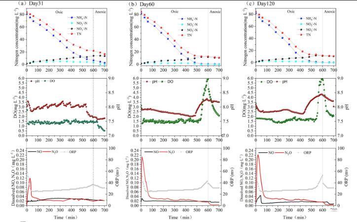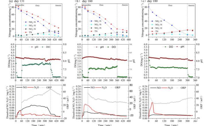 圖4、NH4+-N、NO3–-N和NO2–-N、pH、DO、ORP、溶解NO和溶解N2O在強(qiáng)化階段(a)第131天(強(qiáng)化第1天)的典型循環(huán)中的變化階段),(b)第160天(增強(qiáng)階段第30天),(c)第180天(增強(qiáng)階段第50天)。