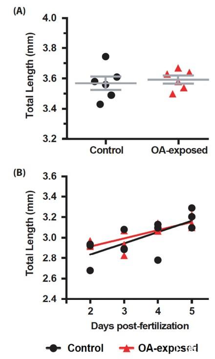 圖1、實驗幼體白鱸的總長度。對照(黑色,圓圈)和OA暴露(紅色,三角形)幼蟲(A)受精后5天的總長度(t(10)=0.4717;p=0.6473),以及(B)2至5天內的總長度受精后(F(1,20)=0.6512;p=0.4292)沒有顯著差異。