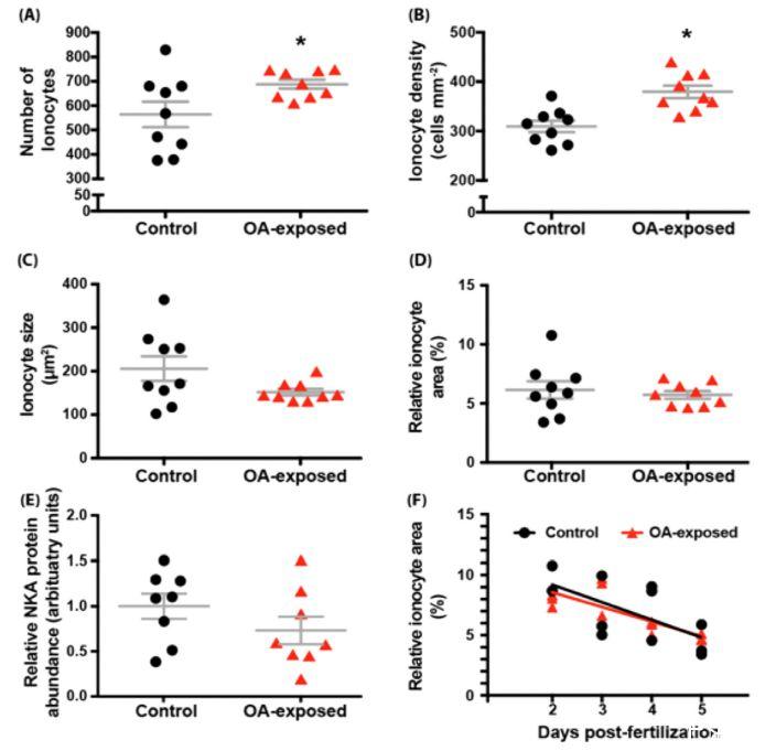 圖2、暴露于對照或OA條件下的白鱸幼蟲的生理反應。(A)離子細胞數量(t(16)=2.223;p=0.0410),(B)離子細胞密度(t(16)=4.106;p=0.0008),(C)離子細胞大小(t(16)=1.843;p=0.0840)、(D)相對離子細胞面積(t(16)=0.5161;p=0.6129)和(E)相對Na+/K+-ATPase豐度(t(14)=1.297;p=0.2156)受精后5天的幼蟲暴露于對照(黑色,圓圈)或OA(紅色,三角形)條件。(F)受精后2至5天白鱸幼體的相對離子細胞面積((1,20)=0.1689;p=0.6855)。星號表示alpha水平為0.05時的顯著性。