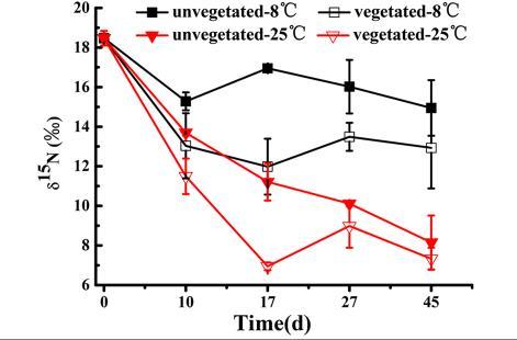 圖5、45天培養實驗中(不同溫度下)收集來自不同實驗條件下的沉淀物15N的含量變化情況。